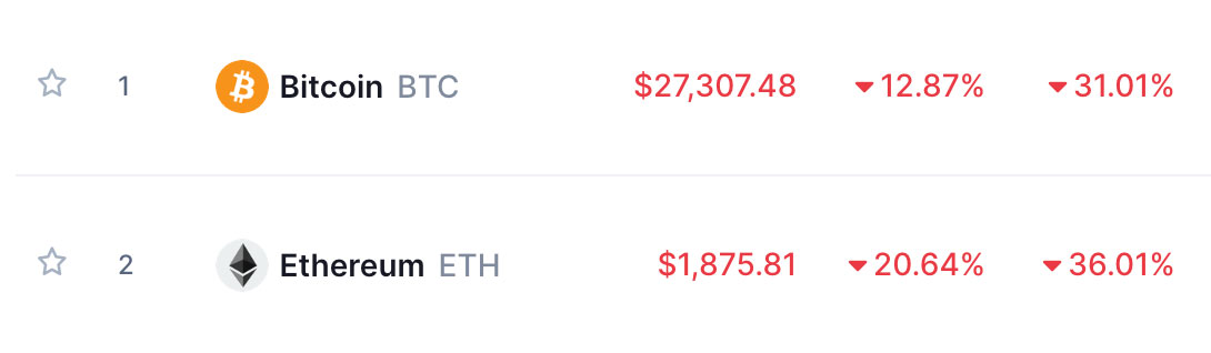 Kripto para dünyasına güncel olarak baktığımız zaman alanın lideri konumunda bulunan bitcoin’in güncel değerlenmesi an itibarıyla 27 bin dolar seviyesinde yer alıyor. Ethereum ise şu an 1.874 dolar seviyesinde geziyor. Bitcoin tarafının son 24 saatlik kaybı yüzde 14’e, son 7 günlük kaybı ise tam yüzde 32’e yaklaştı. Ethereum’un son 24 saatlik kaybı tam yüzde 20’ye, son 7 günlük kaybı ise tam yüzde 37’ye yaklaştı. Genel olarak tüm kripto para dünyası büyük bir çakılma yaşıyor. Bunun özellikle ABD’deki kötü sayılan ekonomik açıklamalar başta olmak üzere birden fazla nedeni bulunuyor ve bu ciddi düşüşün ne kadar süreceği bilinemiyor. Bitcoin’in son 1 ay içerisinde gördüğü en düşük değer 26 bin dolar, en yüksek değer ise 43 bin dolar seviyesinde yer alıyor.