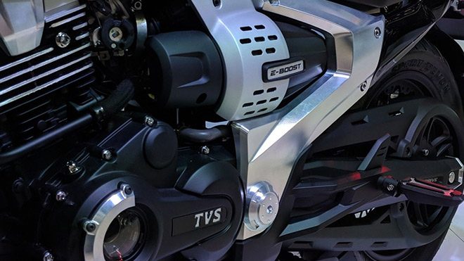 Türkiye’de de hizmet veren motosiklet markalarından birisi olan TVS’in geleceğini simgeleyen Zeppelin Concept’in sınırlı olsa da teknik detaylarını aktarmaya başlayalım. Motor bölümünün geleneksel kısmında 20 beygir güç ve 18,5 Nm tork üreten 220cc‘lik tek silindirli bir makine kullanılıyor. Elektrik kısmında, motora entegre edilmiş patentli bir jeneratör sistemine yer veren TVS mühendisleri, 1.200W‘lık elektronik asistan desteği sunan motorun ihtiyaç duyulan her anda devreye girdiğini belirtiyor. Sistemin batarya bölümünde ise rejeneratif yapıda 48V’luk lityum-iyon ünite var. Beş ileri şanzımanla kombin edilen bu ünite ile birlikte modelin çıkabildiği maksimum sürat değeri ise 130 km/s olarak açıklandı.