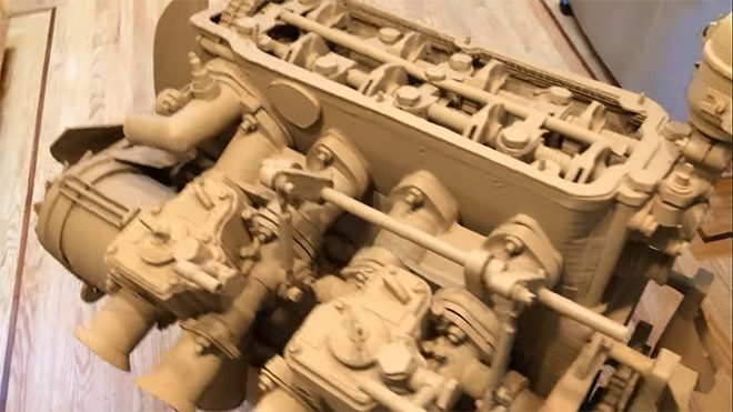 Projenin videosuyla sizleri baş başa bırakmadan önce anlatılması gereken bazı noktların kısaca üzerinden geçmek gerekiyor. Tuvalet kağıdı kartonundan başlayıp hemen her çeşit sert karton çeşidinin kullanıldığı modellemede inanılmaz bir detaylama var. Dış tarafından pervaneden başlayıp triger kayışına kadar uzanan bu detaylar, kapağın açılmasıyla birlikte çok daha şaşırtıcı boyutlara ulaşıyor. Çünkü burada bizler egzantrik miline hatta supaplara kadar varan bölümler karşılamakta. Yaklaşık bir yıl gibi bir sürede tamamlandığı söylenen projeye değer biçmekse bir hayli zor. Tabi ki işin bir de manevi boyutu var.