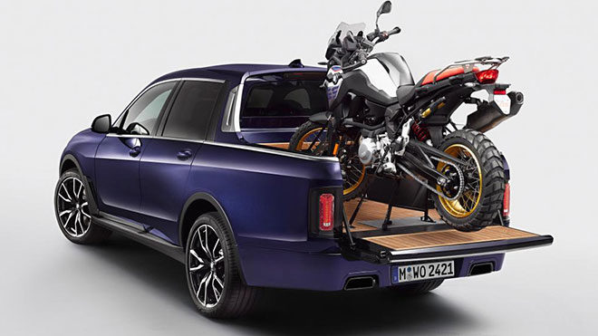 BMW Motorrad Days kapsamında yüzünü gösteren konseptin bu temayı desteklemek adına arkasında bir F 850 GS Touring taşıyacağını görüyoruz. Projenin başlangıcı ise daha önce benzerlerini gördüklerimizdeki gibi arka kabinin ortadan kaldırılmasıyla başlıyor. Bundan sonraki sürecinin tamamı el yapımı olarak ilerleyen araçta karbon fiber malzemeler ve üç boyutlu malzeme temelli dokunuşlar karşımıza çıkıyor. Süspansiyon konusunda da önemli değişimlerin yapıldığını bu noktada belirtmeden geçmeyelim. Standart X7’e oranla 200 kilogram daha hafif olan pickup, bagaj kapağının açık olması durumunda uzunluğu 200 santimetreye kadar olan malzemeleri taşıyabiliyor. Projenin motor bölümünde ise 3.0 litrelik sıralı altı silindir makine karşımıza çıkıyor. yaklaşık 340 beygir güç ve 450 Nm tork üreten bu motorun pickup modelinin hafifleyen yapısıyla daha iyi sürelere erişmesi de beklentiler arasında.