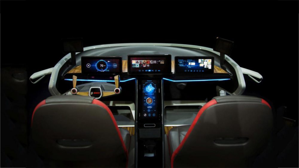 Tasarımında yer verdiği ekranlarla bizleri adeta teknoloji üssünde gibi hissettiren konseptte, elektrik menzili ve anlık hız gibi sürücünün ihtiyaç duyacağı tüm bilgileri direksiyonun arkasında konumlandırılan ekranda bulmak mümkün. Bu ekranla birlikte konsept dahilinde toplamda dört adet ekrana yer verildiğini görüyoruz. Bunlardan bir tanesi yan koltukta oturan yolcu da düşünülerek yapılmış. Diğer iki ekransa tamamen konseptin merkezinde yer alıyor. Hareket algılama yeteneğine sahip olan bu ekranda kullanıcı ekrana temas etmeden multimedya sisteminde gezinebilme ve işlem yapabilme ayrıcalığına sahip. Bosch’un CES 2017 kapsamında tanıttığı diğer ürünlerine buradan ulaşabilirsiniz.