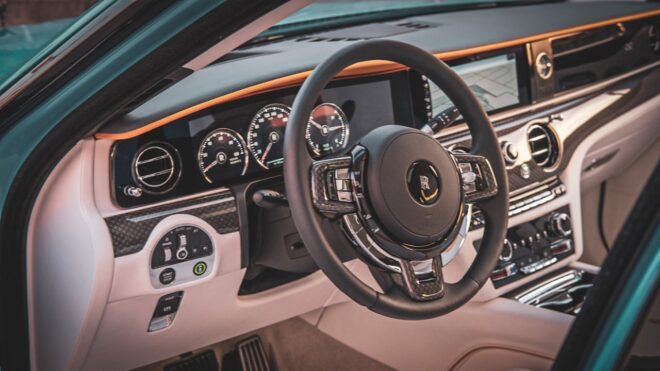 Konfor ve ayrıcalık tarafının yalnızca otomobilin sürüş yetenekleriyle sınırlı olduğunu elbette söylemeyeceğim. Ghost, ürün gamının zirve modeli olmamasına rağmen aracın içerisinde kullanılan malzemelerin kalitesi bambaşka bir seviyede. Paspaslardan başlayan “her şey dahil ultra lüks otel” karşılaması, kullanılan ahşap detaylar ve döşemelerle her adımda bir katman yukarıda hissettiriyor. Arka koltukların ortasında gizlenen size özel şampanya ise, karşılama komitesinin “hoşgeldin sunumu” niteliğinde.