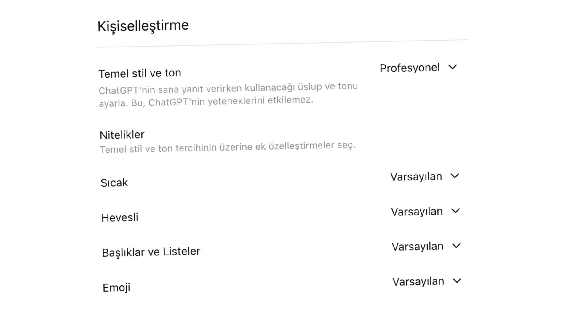 OpenAI, kullanıcıların artık ChatGPT’nin samimiyet (sıcaklık), heyecan düzeyi (heveslilik) ve emoji kullanımı gibi cevap özelliklerini kendilerine göre ayarlayabileceğini duyurdu. Bu seçeneklere “Kişiselleştirme” ayarlarından ulaşılabildiği belirtilirken, kullanıcılara bu tercihler özelinde “daha az” ve “daha fazla” seçenekleri sunuluyor. Örneğin emoji ayarı “daha fazla” konumuna getirilirse yapay zekâ cevaplarında daha sık emoji kullanıyor.