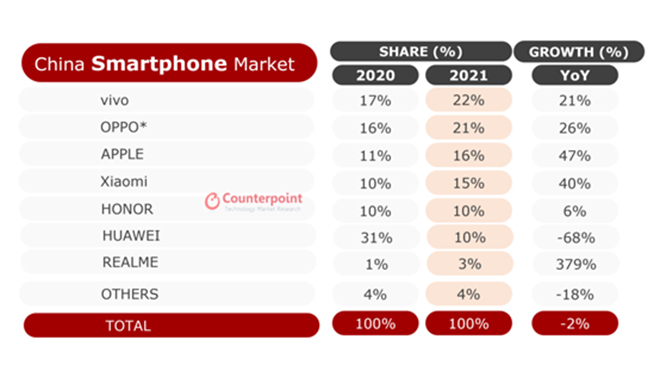 Araştırma şirketi Counterpoint‘in yıl sonu değerlendirmesine göre Vivo, 2021’de Çin akıllı telefon pazarındaki oturduğu birincilik tahtını korudu ve yılı ilk sırada tamamladı.