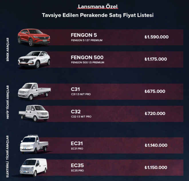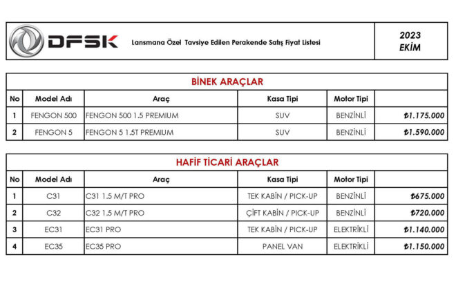 Burada aktarıldığı kadarıyla DFSK Türkiye’deki yeni macerasını ilk aşamada iki farklı benzinli SUV modeli, iki benzinli ticari araç ve iki elektrikli ticari araç ile başlatıyor. Yapılan açıklamaya göre Türkiye’ye önümüzdeki yıl bir mild-hibrit SUV, bir plug-in hibrit SUV ve bir sedan model de getirilecek. Yani genel olarak hemen herkese hitap edecek bir araç sunacak SHSFilo, Türkiye’ye getirilen modellerin fiyatlarını direkt olarak buradaki resmi sitesinde paylaşıyor. Üzerinden burada da geçmek adına Türkiye’ye getirilen Fengon 500 SUV modeli 1.175.000 TL’den, yukarıda gördüğünüz Fengon 5 SUV modeli 1.590.000 TL’den, ticari sınıftaki tek kabin EC31 modeli 1.140.000 TL’den, elektrikli van EC35 modeli 1.150.000 TL’den, tek kabin pick-up C31 1.5 M/T PRO modeli 675.000 TL‘den, son olarak çift kabinli C32 1.5 M/T PRO pick-up öodeli ise 720.000 TL‘den satılıyor. EC31 ve EC35 modellerini elektrikli, diğer tüm araçları ise benzinli olan DFSK, Türkiye’de geniş bir kitleye hitap ediyor, yıl sonuna kadar en az 5 bin araç satmayı hedefliyor. Pazarın güncel durumu göz önüne alındığı zaman buna ulaşması imkansız olmayan firma, Türkiye’de yakında test sürüş imkanı başlatacaklarını da açıklıyor.