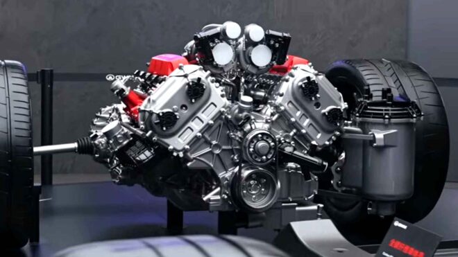 Great Wall Motor (GWM), elektrikli otomobil alanında çığır açan Çin’in, içten yanmalı motor tarafında da iddialı olmasını istiyor. Bu doğrultuda 4.0 litrelik çift turbolu V8’i temel alan yeni otomobil platformu GF’i tanıtan şirket, platformun hem binek araçlarda hem de yarış araçlarında kullanılabileceğini belirtiyor. Platformun bir GT3 yarış aracında 592 beygir güç sunacağı aktarılıyor. Normal araçlarda ise gücün, hibrit sistemin desteğiyle dört çeker üzerinden tam 1.184 beygire kadar çıkarılabileceği söyleniyor. Kuru karterli yağlama sistemine sahip 90 derecelik V8’de her iki turbo da silindir sıralarının arasındaki boşluğa konumlandırılıyor (hot-vee yerleşimi). GF’i temel alan ilk araçların yıl bitmeden önce görücüye çıkarılması bekleniyor.