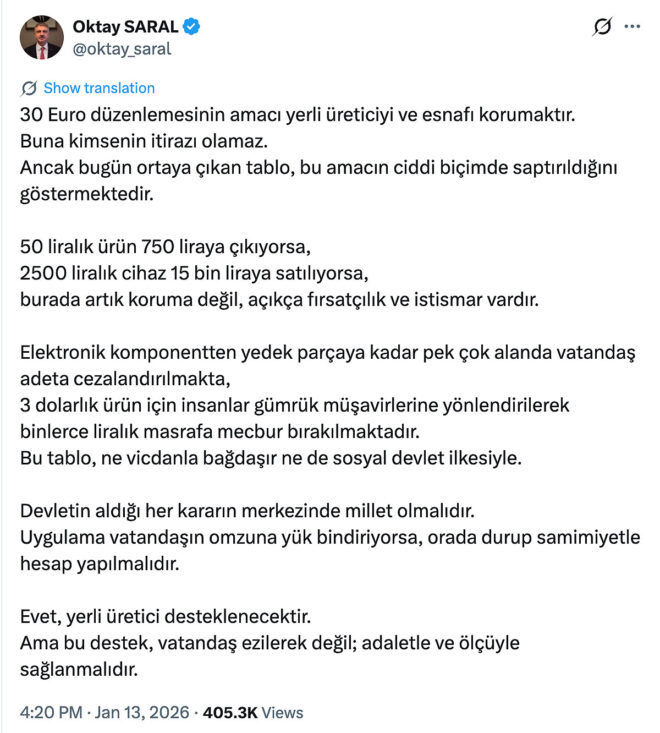 Cumhurbaşkanı Başdanışmanı Oktay Saral, kişisel X hesabı üzerinden yaptığı açıklamada, “30 Euro düzenlemesinin amacı yerli üreticiyi ve esnafı korumaktır. Buna kimsenin itirazı olamaz. Ancak bugün ortaya çıkan tablo, bu amacın ciddi biçimde saptırıldığını göstermektedir.” ifadelerini kullandı ve ek olarak şunları aktardı: “50 liralık ürün 750 liraya çıkıyorsa, 2500 liralık cihaz 15 bin liraya satılıyorsa, burada artık koruma değil, açıkça fırsatçılık ve istismar vardır. Elektronik komponentten yedek parçaya kadar pek çok alanda vatandaş adeta cezalandırılmakta, 3 dolarlık ürün için insanlar gümrük müşavirlerine yönlendirilerek binlerce liralık masrafa mecbur bırakılmaktadır. Bu tablo, ne vicdanla bağdaşır ne de sosyal devlet ilkesiyle. Devletin aldığı her kararın merkezinde millet olmalıdır. Uygulama vatandaşın omzuna yük bindiriyorsa, orada durup samimiyetle hesap yapılmalıdır. Evet, yerli üretici desteklenecektir. Ama bu destek, vatandaş ezilerek değil; adaletle ve ölçüyle sağlanmalıdır.