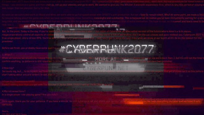 Sunumda gösterilen fragmanda bir de çok uzun bir metin yer alyordu. Oyunla ilgili bu zamana kadar yeni bir şey paylaşmadıkları için özür dileyen firma Blood and Wine’dan sonra hızla Cyberpunk 2077 üzerine çalışmaya başladığını belirtiyor. Alternatif bir gelecekte, Amerika’da geçen oyunda devasa şirketlerin medeni yaşamın tüm yanlarını kontrol ettiği belirtiliyor. Kalanında ise çetelerin hüküm sürdüğü kaydedilmiş. Hikaye odaklı bir RPG olduğu belirtilen oyunda oyuncuların kendi karakterlerini yaratabileceği de kaydediliyor.