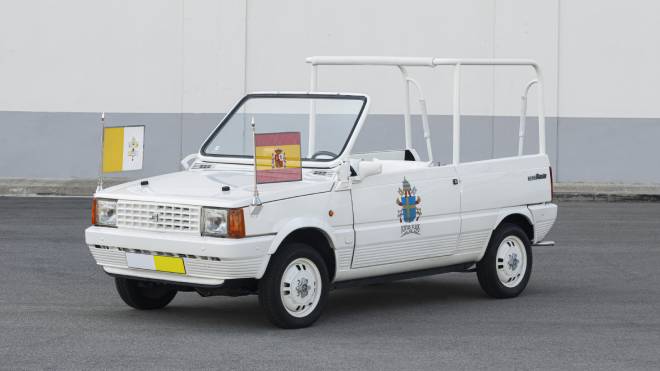 Papa’nın 1982 yılında İspanya’ya düzenleyeceği ziyaret için kendi otomobilinden daha küçük bir otomobile ihtiyaç vardı. Resmi otomobilin ana ziyaret mekanları olan Real Madrid C.F. ve F.C. Barselona stadyumlarının giriş kapılarından geçemeyecek olması bu ihtiyacı doğurdu. Zona Franca Fabrikası çalışanları Panda “Papamóvil”i geliştirdi. Otomobilin tavan ve cam detaylarını tamamen ortadan kaldırarak arka kısımda Papa’nın ayakta durarak halkı selamlayabileceği destekli bir yapı oluşturuldu.