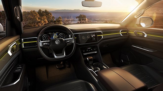 Volkswagen’in diğer modellerinden bildiğimiz MQB platformunu ilk kez bir pickup modeliyle bir araya getirdiği Atlas Tanoak, aynı zamanda yine bu platform üzerine inşa edilmiş en büyük araç konumunda. Uzunluğu ve genel ebatlarıyla 7 kişilik Atlas‘tan bile daha yüksek rakamlara sahip olan model, ilk adımda sunulacağı Amerika pazarında ortanca sınıfta yer alacak. Kabin bölümü de bu genişlik ve uzunluktan nasibini alan konsepte ATV ve motosiklet gibi araçlar rahatlıkla taşınabiliyor. Tasarım kısmında Cross projesinde olduğu gibi logo ve ızgarası ışıklandırmalı olan pikcup, bundan farklı olarak tampon bölümünde de LED ışıklandırmalar barındırıyor. Volkswagen’in tercih ettiği jantların boyutu ise 20 inç. İçerisinde yine yeni Touareg’de gördüğümüz dijital ekran teknolojisini barındıran konseptte, bu ekranların büyüklüğü ve kalitesi premium segmentteki araçları aratmayacak seviyelerde.