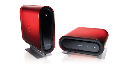 Dell Hybrid yatay ve dikey konumda kullanılabiliyor. Kutu içerisinden çıkan ayakları her iki modda kullanabilmek üzere tasarlanmış. Ön panelde ve yandaki Dell logosu altında bulunan aydınlatmalar hem görsellik, hem de bilgilendirme açısından başarılı. Önde aydınlatılan Hybrid yazısı iki tane. Bilgisayarı dikey ve yatay konumlardan hangisinde kullanıyorsanız ona uygun yazı aydınlatılıyor. Ön panelde iki adet USB bağlantısı, hafıza kart okuyucu, slot DVD sürücü ve doğal olarak güç düğmesi ile sabit disk aktivite lambası bulunuyor. Arka yüzüne baktığımızda küçük bir soğutma fanı ve gerekli bağlantıları görüyoruz. Üç adet USB bağlantısı da arka yüze yerleştirilmiş. Böylece toplamda 5 adet olan USB girişleri her seviyeden kullanıcının ihtiyacını karşılayacak seviyede. Görüntü çıkışı için Hybrid DVI bağlantısını kullanıyor. Fakat kutu içerisinden çıkan DVI’dan VGA’e dönüştürücü kablo sayesinde eski tip monitörlere bağlamak da mümkün. Bu kablo oldukça kısa ve bir ucu DVI, diğer ucu ikili olarak hem DVI, hem de VGA bağlantısına sahip. Yani aynı zamanda biri VGA diğeri DVI olmak üzere iki ekrana görüntü aktarmak mümkün. Görüntü aktarımı için bir diğer seçenek de HDMI çıkışı. Böylece Hybrid’i sahip olduğunuz LCD veya plazma televizyona bağlayabiliyorsunuz. Durum böyle olunca ses aktarımı için de ekstra özelliklerin bulunması gerekiyor. Hybrid üzerinde standart stereo ses çıkışının yanı sıra, optik çıkış da yerleştirilmiş. Eğer optik bağlantılı bir ses sistemi kullanıyorsanız cihaz buna da kolayca bağlanabiliyor. Arka yüzde son olarak firewire ve ethernet bağlantıları bulunuyor.