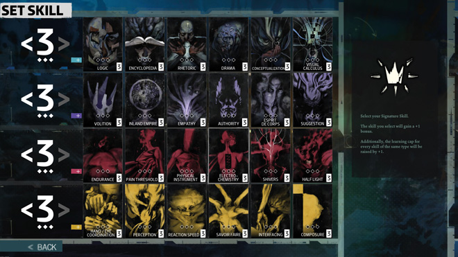 Oyunda 4 temel karakter özelliği 24 ayrı alt özelliğe ayrılıyor. Bu sayede çok zeki olduğunuz için her şeyde mantık yürütebilirken mesela yalan söylemekte çok başarısız olabiliyorsunuz.