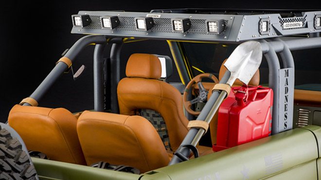 Bronco baz alındığında bu zamana kadar yapılmış en etkileyici projelerden birisi olarak nitelendirebileceğimiz Urban Madness, 1969 model yıllı araca askeri bir karakter dokunuşunu getiriyor. Devasa arazi lastikleri, LED ışıklandırma destekleri, gövde ve koruma panelleriyle ruhuna uygun parçaların kullanıldığı aracın kaputunun altında ise 300 beygirin üzerinde güç üreten Ford Performance imzalı 4,9 litrelik V8 motor kullanılıyor. Diğer göze çarpan özellikler arasında ise el yapımı bir Bronco ızgarası, kesilmiş çelik kapılar, WARN vinç, el işi deri iç mekan, dijital gösterge ve Kicker ses sistemi yer alıyor. Yeni jenerasyonla birlikte bağımsız garajların çok daha fazla ilgi göstermesini beklediğimiz Bronco, dönüşünün keskin adımlarını bu yılın sonuna doğru atabilir.