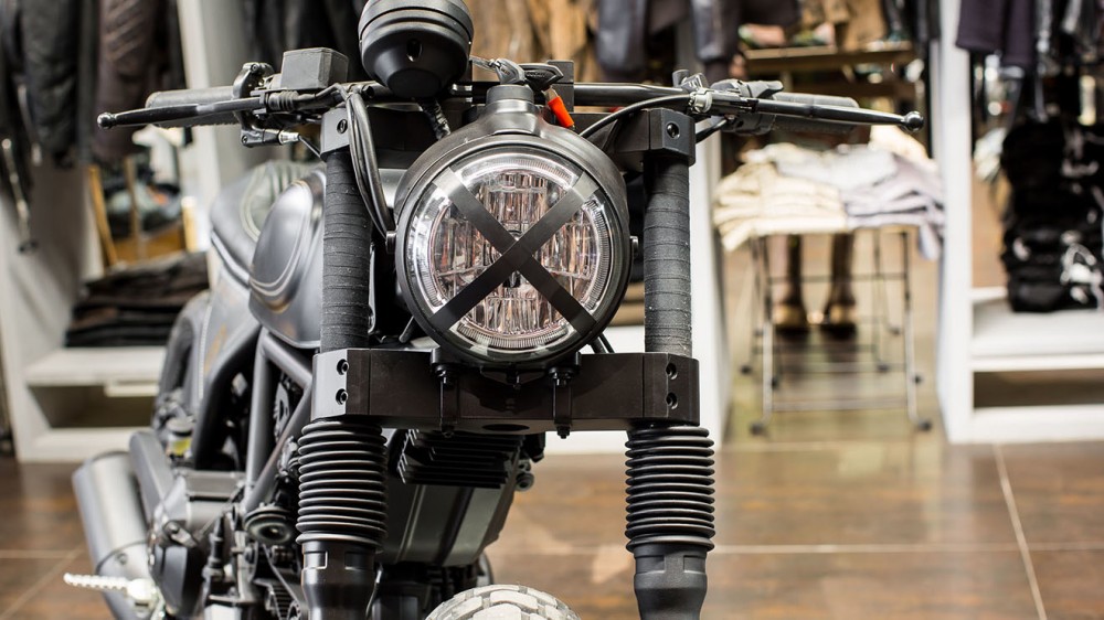 Scrambler’ın retro ruhuna en yakın yorum, Revolution adıyla Officine Mermaid’den geliyor. Parlak siyahlığın yanında ince altın renk detaylarıyla dikkat çeken Revolution, yenilenen deri selesi, korumalı ön farı ve ön çatallarıyla evrimini tamamlıyor.