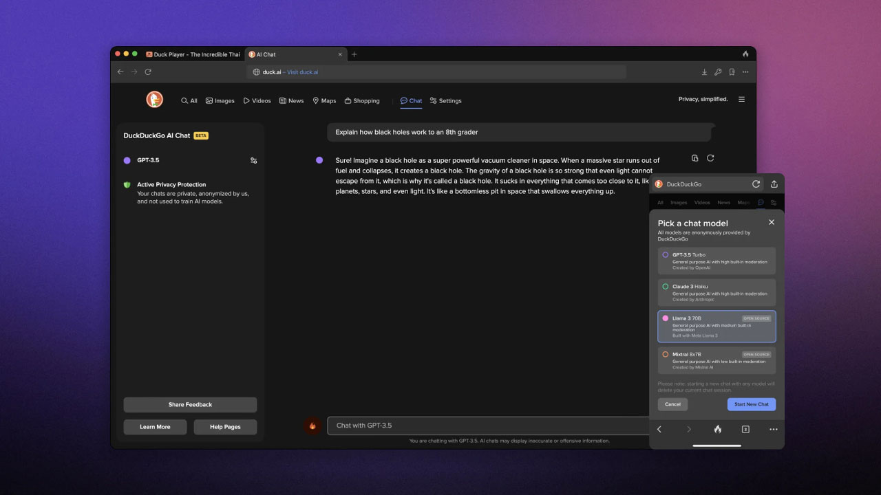 Gizlilik odaklı tarayıcılar arasında dikkat çekmeye devam eden DuckDuckGo, güvenli/gizli sohbet botu erişim sunmaya başladı.