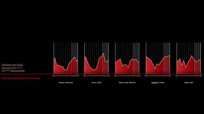 Araştırmaya göre, Türkiye için hava kirliliğinin en yüksek olduğu ay Aralık iken, İstanbul için bu, Şubat ayı… İstanbul’un yıllık ortalama PM2.5 seviyesinin DSÖ yıllık maruziyet kılavuzunun dört katı olduğu görülüyor. Ulusal ortalama veriler, Aralık ayında DSÖ kılavuzunun 5,5 katına ulaşırken; İstanbul iç mekân hava kalitesi verilerinde Şubat ayında DSÖ maruziyet kılavuzunun 5 katına ulaşıyor ve Aralık, Ocak ve Mart aylarında neredeyse 5 katına ulaşıyor.
