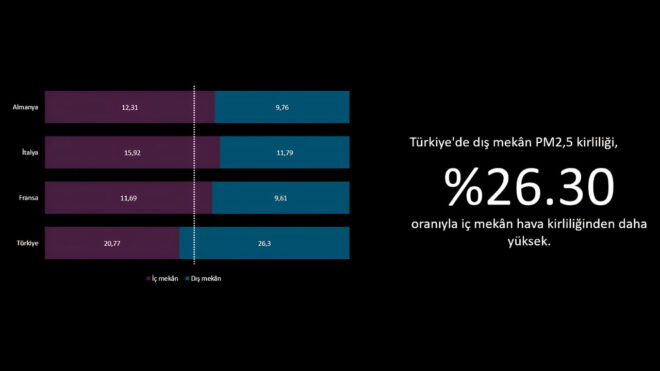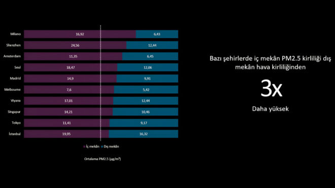 P.M2.5 değerleri incelendiğinde, çoğu ülkede iç mekân hava kirliliğinin dış mekân hava kirliliğinden daha yüksek olduğu görülüyor. Türkiye’de genel olarak iç mekân hava kirliliği dış mekân hava kirliliğinden daha düşükken, araştırma sonuçlarına göre bir metropol olan İstanbul’da tam tersi bir durum söz konusu ve iç mekân havası dış mekân havasından daha kirli. İstanbul, araştırmadaki şehirler arasında en yüksek P.M2.5 değerlerine sahip 10. şehir olarak sıralanıyor.