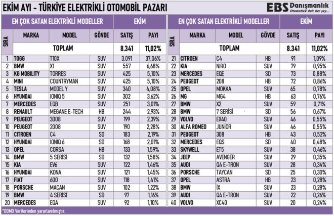 Emre Özpeynirci tarafından burada yapılan paylaşıma göre ekim ayında Türkiye’de en çok satılan sıfır elektrikli otomobil modeli, 3.091 adetlik satışla Togg T10X oldu. İkinci sırada karşımıza 557 adetlik satışa ulaşan BMW X1 çıkıyor, üçüncü sırada ise 425 adetlik satışla KG Mobility Torres bulunuyor. Satış konusunda ekim ayının ilk 10 modeli tam olarak şöyle sıralanıyor: