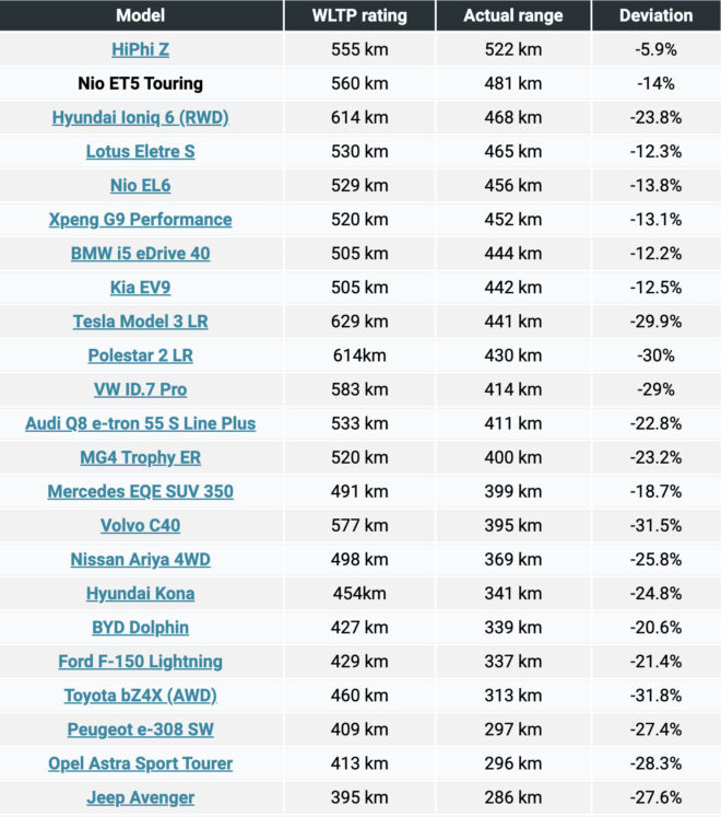 Burada en kötü performansı gösteren araç ise Toyota bZ4X 2WD oldu. Resmi olarak 460 km WLTP menzili açıklanan araç, soğuk hava şartlarında ancak 313 km yol yapabildi. Testlerde kötü performans gösteren araçlardan birisi de Tesla Model 3 Long Range oldu. Resmi olarak 629 km WLTP menzili açıklanan araç, soğuk hava şartlarında yüzde 30 kayıpla ancak 414 km yol yapabildi. Volvo C40 da iyi bir sonuç ortaya koymadı. Resmi olarak 577 km WLTP menzili açıklanan araç, soğuk hava şartlarında 395 km yol yapabildi. Teste giren tüm araçlar için sonuç şöyle oldu: