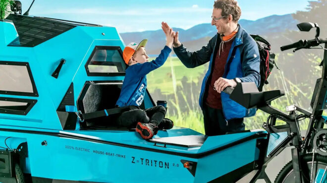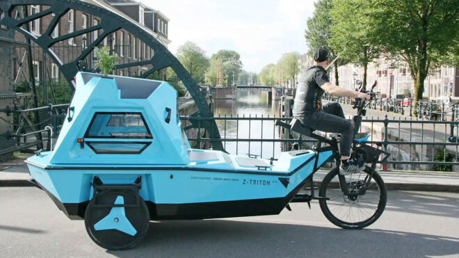 Son dönemde gördüğümüz en ilgi çekici ve fark yaratan araçlardan BeTriton, elektrikli bisiklet, tekne ve kamp aracını bir araya getiriyor.