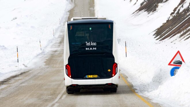 Elektrikli otobüs MAN Lion’s Coach E, Erzurum ve İsveç’te kış testlerine alındı. Şirket başarıyla tamamlanan testler hakkında şu bilgileri aktardı: “Geleneksel kış test programı kapsamında; tamamen elektrikli dört Lion’s Coach E modelinin de dahil olduğu toplam dokuz araç, Erzurum ve İsveç’teki aşırı soğuk, kar, buz ve zorlu arazi koşullarında binlerce kilometrelik testlerde etkileyici bir performans ortaya koydu; dayanıklılıklarını kanıtladı.” Araçların aşırı iklim koşullarındaki başarılı performansından memnun olduklarını ifade eden MAN Truck & Bus Otobüs Bölümü Başkanı Barbaros Oktay, “Geçen sonbaharda Busworld Europe’da dünya prömiyerini yaptığımız tamamen elektrikli yeni otobüsümüzden büyük beklentiler var. Gerçekleştirdiğimiz bu yoğun testler sayesinde bu beklentileri tam olarak karşılamayı hedefliyoruz. Ancak bu dondurucu soğuklarda bile Lion’s Coach E, beklentilerimizi tam olarak karşıladı. Tüm bileşenler ve sistemler, soğuğa rağmen güvenilir bir şekilde çalıştı” dedi.