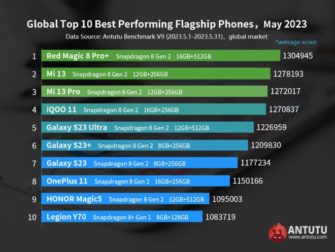 Bu listeyi düzenli olarak bünyesinde yapılan performans testlerinden hazırlayan pazarın önemli otoritesi AnTuTu, bugün itibarıyla 2023 mayıs ayının en güçlü Android telefon modellerini de karşımıza getirmiş durumda. Yapılan küresel olarak satılan telefonları kapsayan yeni paylaşıma göre geride bıraktığımız ayın en güçlü Android telefon modeli, Türkiye’de henüz satılmayan ancak ileride satılma ihtimali bulunan (İhtimalin detayları direkt olarak burada) Red Magic 8 Pro Plus oldu. İkinci ve üçüncü sırada karşımıza Xiaomi 13 ve Xiaomi 13 Pro çıkıyor. Yayınlanan en güçlü Android telefon modelleri listesindeki tüm telefonlar ise tam olarak şöyle sıralanıyor: