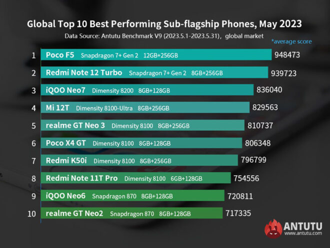 Mayıs ayındaki listede en çok kullanılan işlemci direkt olarak Snapdragon 8 Gen 2 oldu. İlk 10 içerisinde iki ay önce MediaTek Dimensity 9000+ işlemci seçeneği de yer alıyordu. Son iki aydır ise bütün listeyi Snapdragon işlemciler kapatıyor. Mayıs ayının daha fazla kişiye hitap eden orta ve orta üst seviyedeki en güçlü Android modelleri ise şu şekilde karşımıza çıkıyor: