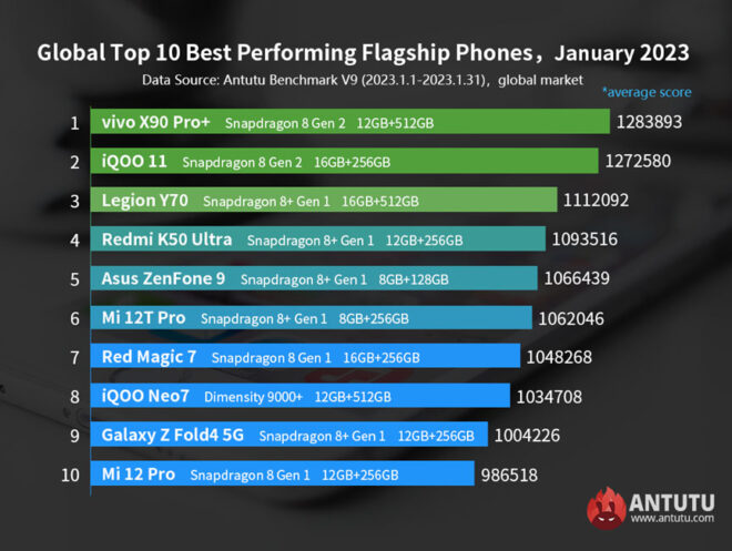 Bu listeyi düzenli olarak bünyesinde yapılan performans testlerinden hazırlayan pazarın önemli otoritesi AnTuTu, bugün itibarıyla 2023 ocak ayının en güçlü Android telefon modellerini de karşımıza getirmiş durumda. Yapılan küresel olarak satılan telefonları kapsayan yeni paylaşıma göre geride bıraktığımız ayın en güçlü Android telefon modeli, aralık ayında da olduğu gibi Türkiye’de satılmayan vivo X90 Pro+ oldu. İkinci ve üçüncü sırada ise yine Türkiye’de satılmayan iQOO 11 ve Lenovo Y70 yer alıyor. Yayınlanan en güçlü Android telefon modelleri listesindeki tüm telefonlar ise tam olarak şöyle: