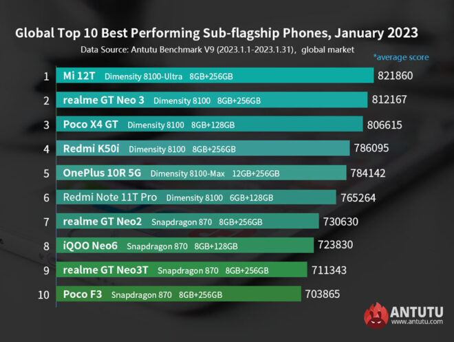 Aralık ayındaki listede en çok kullanılan işlemci bir kez daha Snapdragon 8 Gen 1 ve Snapdragon 8 Plus Gen 1 oldu. İlk 10 içerisinde ayrı olarak MediaTek Dimensity 9000 işlemci seçeneği de yer alıyor. Aralık ayının en üstteki iki modelinde ise Snapdragon 8 Gen 2 kullanılıyor. Aralık ayının orta ve orta üst seviyedeki en güçlü Android modelleri ise şu şekilde karşımıza çıkıyor: