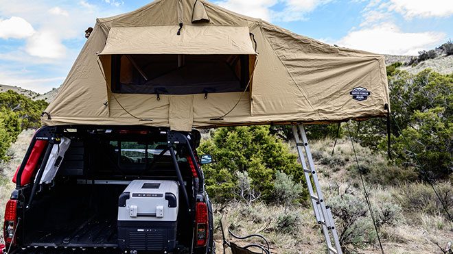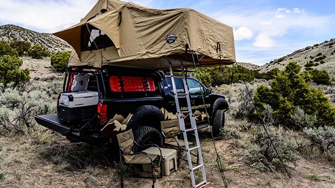 Nissan ekibi etkinlik kapsamında sergilediği aracı Frontier Crew Cab Midnight Edition versiyonu üzerine geliştirmeyi tercih etmiş. Versiyon üzerine herek görünümü gerekse niteliği etkileyen çok ciddi ekipman salatasının araca eklendiğini söyleyebiliriz. Burada ilk aşamada 33 inçlik lastik setini, dodikleri, süspansiyonları, yanal basamakları ve öne eklenen LED ışıklandırma grubunu ön plana çıkartmak gerekiyor. İşin arazi ve sürüş kısmından sorumlu olan bu bütüne karavan niteliği katansa tavana entegre edilen çadır mimarisi. Bu setle birlikte buzdolabı gibi hayati bir parçanın standart olarak eklenmiş olması oldukça yerinde bir hamle. Kaputunun altında 4.0 litrelik motorun bulunduğu Frontier, bu sayede 261 beygir güç ve 381 Nm tork değerlerini asfalta yansıtıyor. Aracın satışa sunmayacak olan Nissan’a göre yaklaşık 40.000 dolara böyle bir aracın elde edilebilmesi mümkün. Tabi ki kullanıcıların ekleyeceği diğer ekipmanlarla birlikte bu rakam kolaylıkla yükselebilir.