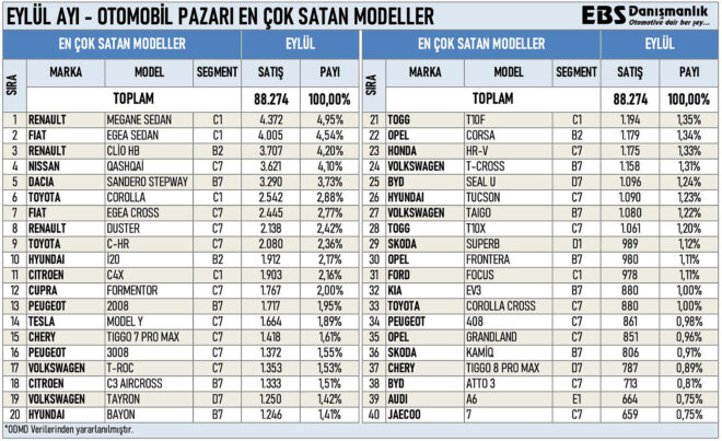Otomotiv Distribütörleri ve Mobilite Derneği verileri üzerinden eylül ayında Türkiye’de en çok satılan sıfır otomobil modelleri listelendi.