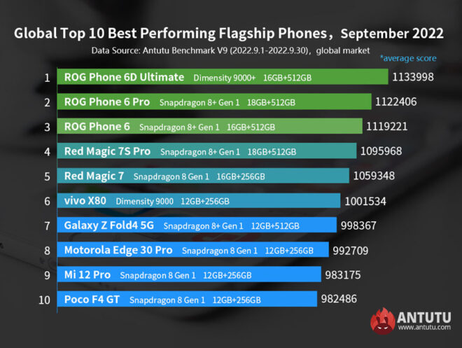 Eylül ayındaki listede en çok kullanılan işlemci bir kez daha Snapdragon 8 Gen 1 ve Snapdragon 8 Gen 1 Plus oldu. İlk 10 içerisinde ayrı olarak MediaTek Dimensity 9000 ve MediaTek Dimensity 9000 Plus işlemciler de yer alıyor. Hatta lider model ROG Phone 6D Ultimate de direkt olarak MediaTek Dimensity 9000 Plus işlemci üzerine kuruluyor.
