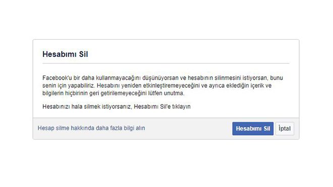 Platformun genel ayarlar kategorisinde hesap silme seçeneği yer almıyor. Bu sebeple direkt olarak burada yer alan hesap kapatma linkine tıklamanız gerekiyor. Çıkan pencerede “hesabımı sil” seçeneğine basmanız yeterli oluyor. Kalıcı olarak silme işlemi birkaç gün sürebiliyor. Eğer bu süreçte Facebook hesabınıza yeniden giriş yaparsanız hesap silme talebiniz otomatik olarak iptal ediliyor. Bu yüzden platformdan uzak durma kararını anında uygulamaya başlamak gerekiyor.