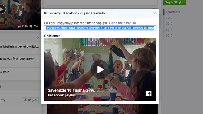 Bilindiği üzere eskiden Facebook’un video oynatıcısında embed özelliği bulunmuyordu. Dolayısıyla videoları farklı sitelerde yayınlamak da mümkün değildi. Yeni eklenen özellik, gönderinin yanı sıra yalnızca videoyu da siteye eklemeyi mümkün hale getiriyor. Özelliği kullanabilmek için video bulunan gönderinin sağ üst köşesindeki seçenekler kısmına tıklamak gerekiyor. Sonrasında ise “Videonu sitene göm” seçeneği işaretleniyor. Açılan pencerede videonun boyutlarıyla ilgili gereken ayarlar da yapıldıktan sonra oluşturulan link istenen siteye eklenebiliyor.