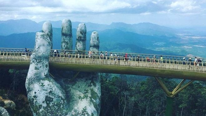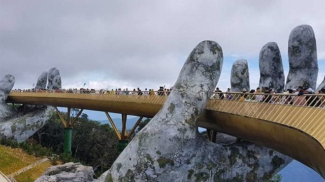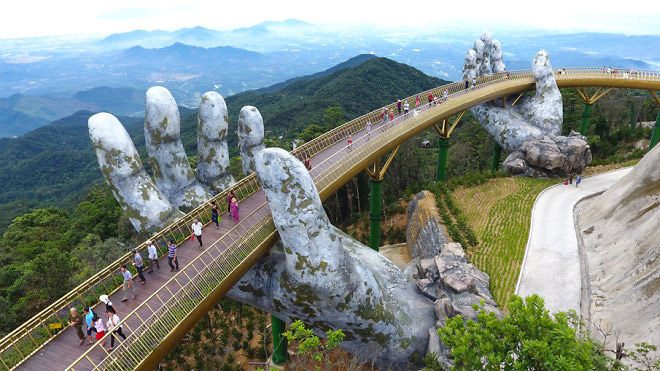 Vietnam’da Bà Nà Hills’in üzerinde yer alan Golden Bridge, ziyaretçileri tasarımıyla büyülüyor. Deniz seviyesinin 1.400 metre üzerinde konumlanan bu köprü, fantastik tasarımıyla benzersiz bir görsellik sunuyor. Fantastik kitaplardan fırlamış gibi görünen köprü, taştan devasa iki el tarafından tutuluyormuş gibi inşa edilmiş. Kıvrımlı, etkileyici bir tasarıma sahip olan Golden Bridge ise ismindeki altını, altın renkli yolundan alıyor. TA Landscape Architecture tarafından tasarlanan köprü haziran ayından bu yana ziyaretçi akınına uğruyor.