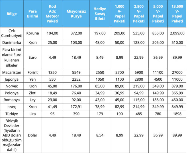 Bu konuda Fortnite tarafından yapılan “Ekim 2023’te Çek Cumhuriyeti, Danimarka, para birimi olarak euro kullanan ülkeler, Macaristan, Japonya, Norveç, Polonya, Romanya, İsveç, Türkiye ve Amerika Birleşik Devletleri için gelecek Fortnite fiyatlandırma düzenlemesi” başlıklı açıklamada şunlar aktarıldı: “Herkese selam! Çek Cumhuriyeti, Danimarka, para birimi olarak Euro kullanan ülkeler, Macaristan, Japonya, Norveç, Polonya, Romanya, İsveç, Türkiye ve Amerika Birleşik Devletleri (ABD doları kullanılan tüm mağazalar dahil) için V-Papel ve gerçek parayla alınan içerik paketi tekliflerimizin bedellerini 27 Ekim 2023’te güncelliyoruz. Bu düzenlemeler enflasyon ve kur dalgalanmaları gibi ekonomik etmenlere dayanıyor ve kısa süre önce Birleşik Krallık, Kanada ve Meksika için gerçekleştirdiğimiz benzeri fiyatlandırma düzenlemelerini takip ediyor. Not: Bu değişiklikler, Fortnite Tayfası aboneliğinin bedelini etkilemeyecek. Şu paketlerin fiyatları gelecekte tekrar mevcut olduklarında düzenlenecek: Öteki Taraf Paketi, Kemik Kadro Paketi, Vampir Drift Görev Paketi, Güzide Akademisi Görev Paketi ve Transformers Paketi. Bazı mağazalardaki fiyatlar, aşağıda belirtilen fiyatlardan biraz farklı olabilir.” Yapılan güncelleme sonrasında fiyatlar şöyle oldu: