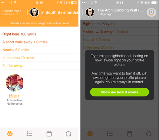 Buna ek olarak Swarm’da bulunan semt paylaşım özelliğiyle uygulamanın bulunduğunuz semti otomatik olarak göstermesini sağlayabiliyorsunuz. Yani belirli bir mekanda check-in yapmasanız dahi takipçileriniz bulunduğunuz bölgeyi görebiliyor. Ancak nerede bulunduğunu her an paylaşmak istemeyenler bu özelliği kapalı tutabiliyor. Semt paylaşımı açık olan arkadaşlarınızı yakınlık sırasına göre listeleyen uygulamayla kimin size ne kadar mesafede bulunduğunu bir bakışta görebiliyorsunuz.
