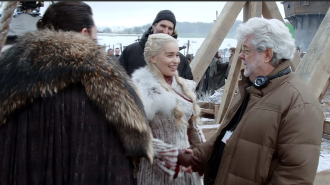 Dizinin yaratıcılarından David Benioff, George Lucas’ın seti ziyaret etmek istediğini ilk duyduğunda bunu bir şaka sandığını itiraf ediyor. Lucas’ın sete ziyaretinin ise herkesi heyecanlandırdığını ve gerdiğini kaydediyor. Hazırlanan sahne arkası videosunun tamamına haberin üzerinden ulaşabilirsiniz.