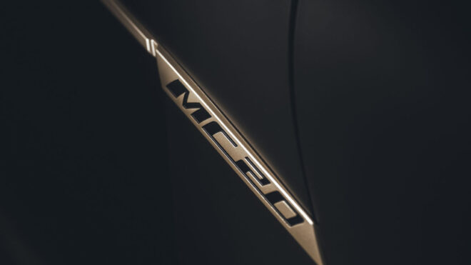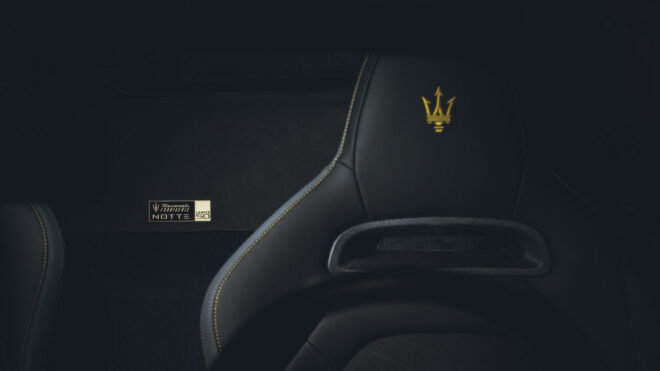 MC20 Notte’nin dışı parlak siyahtan manyetik mat “nero essenza” rengine büründü ve pist avcısı Bertolini’nin “Midas dokunuşu” sayesinde karanlıkta parlayan bir yıldıza dönüştü. Yan logolarda bulunan Trident amblemi ve şirket imzası gümüşten mat beyaz altın rengiyle Maserati’nin motor sporları anılarını yeniden canlandırdı. MC20 Notte’de yola yapışmış olan 20 inç mat siyah kuş kafesi tekerlekler, mat beyaz altın renkli detaylara sahip, fren kaliperleri ise siyah.