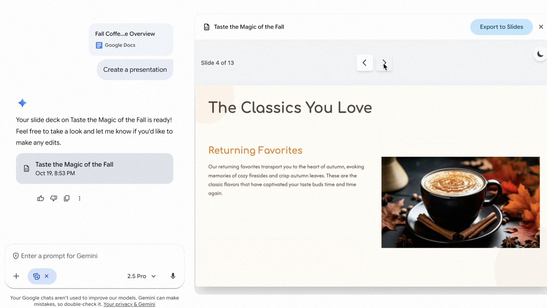 Uzun süredir kullanımda olan Gemini temelli özellik “Canvas”, kullanıcıların hem belgeler hem de kodlar üzerinde gerçek zamanlı olarak çalışmalar yapabileceği, kullanışlı bir alan sunuyor. Daha önce “Composer” olarak adlandırılan bu özellik, gerçek zamanlı değişiklikler sağladığı için çalışmalara hız katıyor. Canvas, yapılan güncelleme sayesinde artık yüklenen dosyaları analiz ederek saniyeler içinde görsel açıdan estetik sunumlar da hazırlayabiliyor. Hazırlanan sunumlar doğrudan Google Slides’a aktarılabiliyor ve içerik yazılı komutlarla istenildiği gibi özelleştirilebiliyor. Özelliğin yakında herkese açılması bekleniyor.