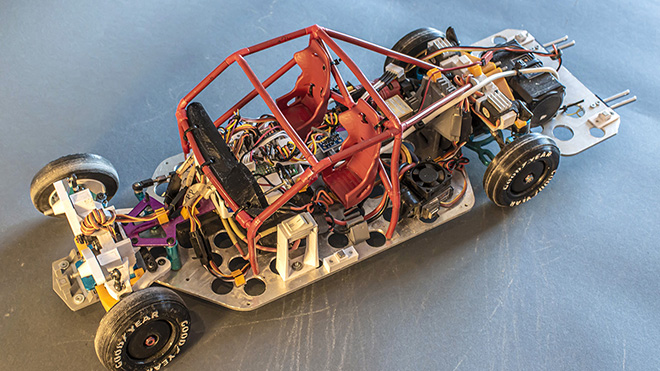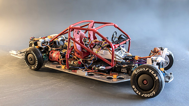 R/C aracı tasarlayan Dimitar Tilev, otomobildeki hareketlerin ivmeölçer, aktif süspansiyon sistemi oluşturan Arduino programlanabilir devre katına ve dört adet servo motora bağlı olduğunu söylüyor. Aktif bir süspansiyon sistemi, genellikle aracı olabildiğince sabit tutmak için aktif olarak kendini ayarlayabiliyor. Sistem, tekerleklerin her birini tam boyutlu bir arabanın hareketlerini ve ağırlığını simüle edecek şekilde aktif olarak kaldırıyor ve indiriyor.