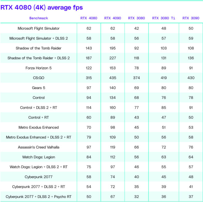 Sonuç elbette harika görünüyor. Referans tasarımı ile RTX 4090’a oldukça yakın olan yani çok büyük bir ekran kartı olan Nvidia RTX 4080, yerini aldığı RTX 3080’den daha az enerji harcıyor ancak çok daha yüksek performans sunuyor. DLSS 3 desteği de olan ekran kartı, yapılan testlere göre 4K’da birçok iyi grafiklere sahip güncel oyunu 60 fps üstünde oynatabiliyor. Ortalamaya vurulduğu zaman RTX 3080’den 4K çözünürlükte yüzde 50 daha hızlı olan kartın elde ettiği bazı FPS değerleri hemen aşağıda görülebiliyor: