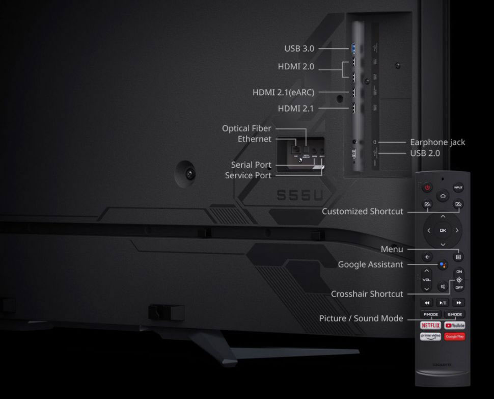Gigabyte S55U, bünyesinde iki adet 10W hoparlör taşıyor ve burada DTS HD ile Dolby Atmos desteklerini de teknik özellik tablosuna yazıyor. Temelinde Android işletim sistemi olduğundan ve bir kumanda ile geldiğinden bağımsız olarak kullanma potansiyeli de bulunan oyun monitörü, 5,000:1 kontrast değerine sahip.