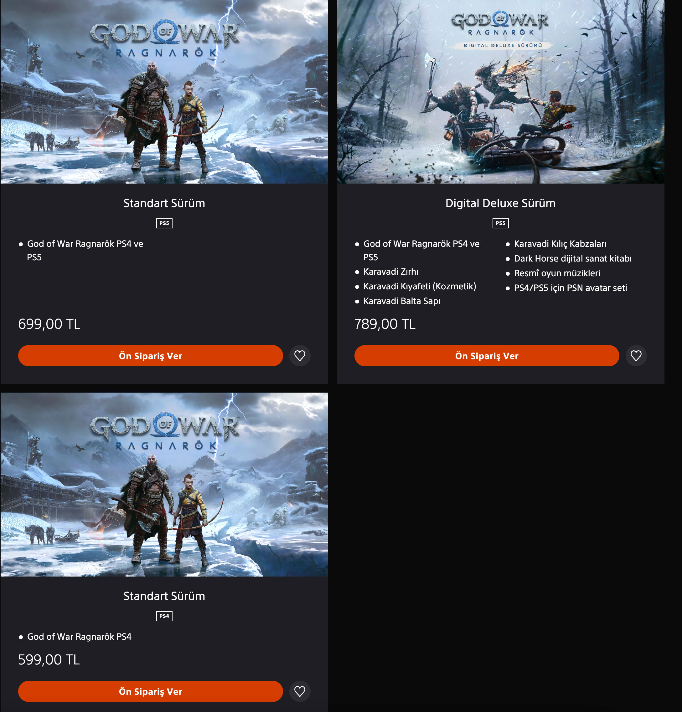 2023 yılına kalacağı söylentileri uzun zamandır gündemde olan God of War Ragnarök, Türkçe altyazı seçeneğiyle 9 Kasım 2022 tarihinde PS4 ve PS5 için geliyor. Yeni yıla kalmamış olması büyük bir kesimi fazlasıyla sevindiren oyun, PlayStation 5 ve PlayStation 4 sahipleri tarafından merakla bekleniyor ve Türkiye’de şu an resmi PlayStation oyun marketinden elde edilebiliyor. Oyunun Türkiye ön sipariş fiyatı ise PS4 için 599 TL, PS5 içinse 699 TL seviyesinde. Yapımın ekstralara sahip “Digital Deluxe” sürümü içinse 789 TL verilmesi gerekiyor. Oyunun Türkiye fiyatı güncel kurlar üzerinden elbette yüksek ancak yurt dışı fiyatına oranla yine de iyi seviyede sayılabilir. “30 FPS 4K” ve “60 FPS 4K’ya dinamik yükseltme” olmak üzere iki farklı modda gelen oyunu ön sipariş yapanlara bazı hediyelerin verildiğini de belirtelim.