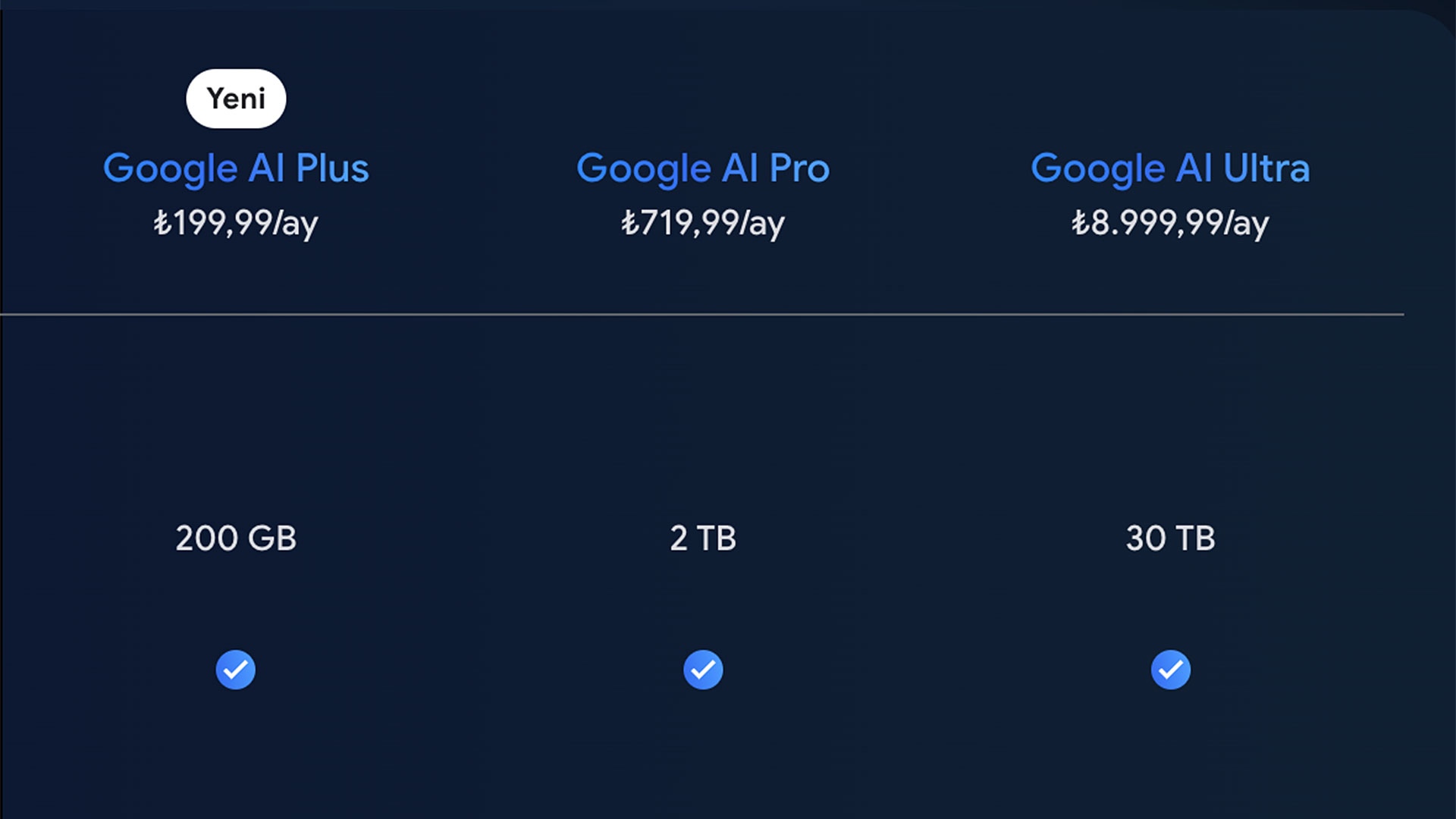 İlk aşamada yalnızca Endonezya’da sunulan Google AI Plus aboneliği en son Angola, Bangladeş, Benin, Bolivya, Burkina Faso, Kamboçya, Kamerun, Fildişi Sahili, Mısır, El Salvador, Gana, Haiti, Honduras, Kenya, Kırgızistan, Laos, Mali, Meksika, Moldova, Fas, Mozambik, Nepal, Nikaragua, Nijerya, Pakistan, Papua Yeni Gine, Filipinler, Ruanda, Senegal, Tacikistan, Tanzanya, Togo, Tunus, Uganda, Ukrayna, Özbekistan, Vietnam, Yemen, Zambiya ve Zimbabve’de kullanıma sunulmuştu. Bugün itibarıyla aylık 199,99 TL’den Türkiye’ye de getirilen paket hakkında Google’ın resmi açıklaması şöyle: “Google AI Plus ile Google’ın Yapay Zekası ekosistemine uygun fiyatlı erişim elde edin. Bu plan, Google AI Pro ve Google AI Ultra’da daha yüksek kullanım sınırı olan erişim planlarına kolayca yapılabilen yükseltme yoluyla belirli yapay zeka özelliklerine erişim sunar. Bu üyelik, Google’ın Yapay Zekası’ndan uygun maliyetle yararlanmanızı sağlar.”