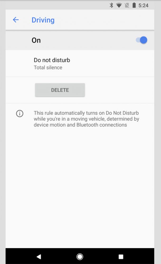 Ekran görüntüsünde Google Pixel 2’nin sürüş sırasında otomatik olarak “rahatsız etme” moduna geçiş yaptığı görülüyor. Bu ayarın açılması halinde telefonunuz hareketli bir araç içinde olduğunuzu algılıyor. Böylece otomatik olarak “rahatsız etme” moduna geçerek sürücünün dikkatinin dağılmasına engel oluyor.