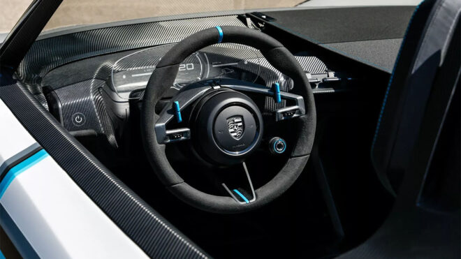 Üzerinde çok sayıda mavi detayın yer aldığı 357 Vision Speedster, elbette şimdilik bir üretim amacı taşımıyor. Gövdesinde “Grivelo Gri Metalik” ve “Mermer Gri” isimleri verilen iki farklı rengin bir araya getirildiği konsept, büyük 75. yıl logolarıyla süslenmiş durumda. Bu logolar gövdede yer alıyor çünkü ilham alınan orijinal 356 bu yıl tam 75. yaşına giriyor. Normal Porsche Vision 357 gibi geçmiş ile gelecek arasında güzel bir bağ kuran “Speedster”, keşke bu formda gerçek olsa ve yollara çıkarılsa yorumunu alan konseptler arasına giriş yapıyor.