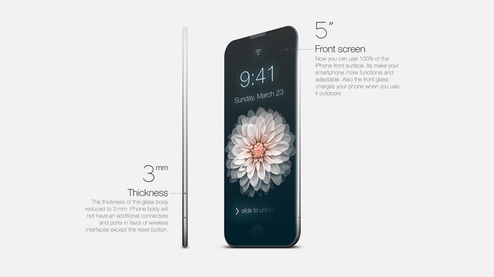 Bu eşsiz iPhone konsepti, tasarımcının kendi hayali olsa dahi hiçbir iPhone kullanıcısının hayır diyemeyeceği özelliklere sahip. Üzerinde hiçbir bağlantı girişi bulundurmayan telefon, tüm bağlantılarını kablosuz olarak gerçekleştiriyor. 5 inç büyüklüğündeki ekranda çerçeve bulunmuyor. Böylece görüntü telefonun tamamına yayılıyor ve özellikle video izlemek veya oyun oynamak kusursuz bir deneyime dönüşüyor.