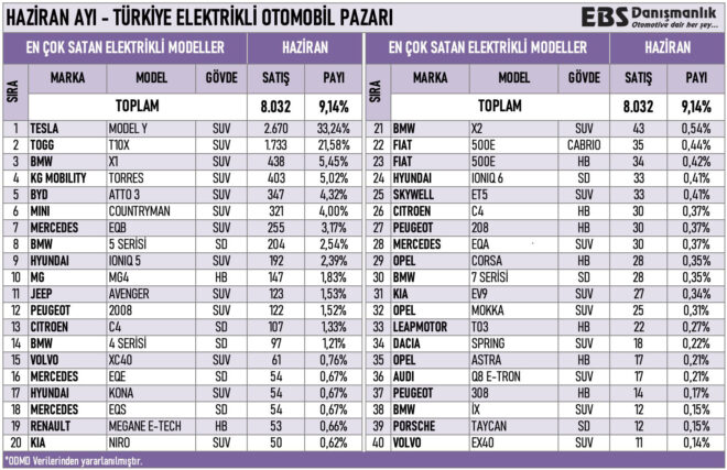 Otomotiv Distribütörleri ve Mobilite Derneği verileri üzerinden 2024 Haziran ayında Türkiye’de en çok satılan sıfır elektrikli otomobil modelleri listelendi.