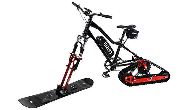 Envo, hazırladığı sayfada gördüğünüz ürün ile elektrikli olmasına gerek kalmadan hemen her bisikleti elektrikli kar bisikleti haline getirebiliyor. Bunun için temel olarak üç parçadan oluşan ürün, arka kısmında elektrik motorunu barındıran bir palet sistemi taşıyor. Ön kısımda ise yönlendirme için tek bir kayak parçası kullanılıyor. Sisteme gücünü veren 48 V / 17.5 Ah pil ise merkeze yerleştiriliyor. Bu kiti montaj etmek içinse tercih edilen bisikletin lastiklerini sökmek temel olarak yeterli oluyor. Bu açıdan kullanışlı olan Envo dönüşüm kiti, açıklandığı kadarıyla 1.2 kW gücünde ve kar üstünde rahat yol alınabilmesi için ciddi şekilde pedal desteği sağlayabiliyor. Açıklanan menzili 10 km seviyesinde olan ürün, yol şartlarına bağlı olarak 18 km/s hız getiriyor.